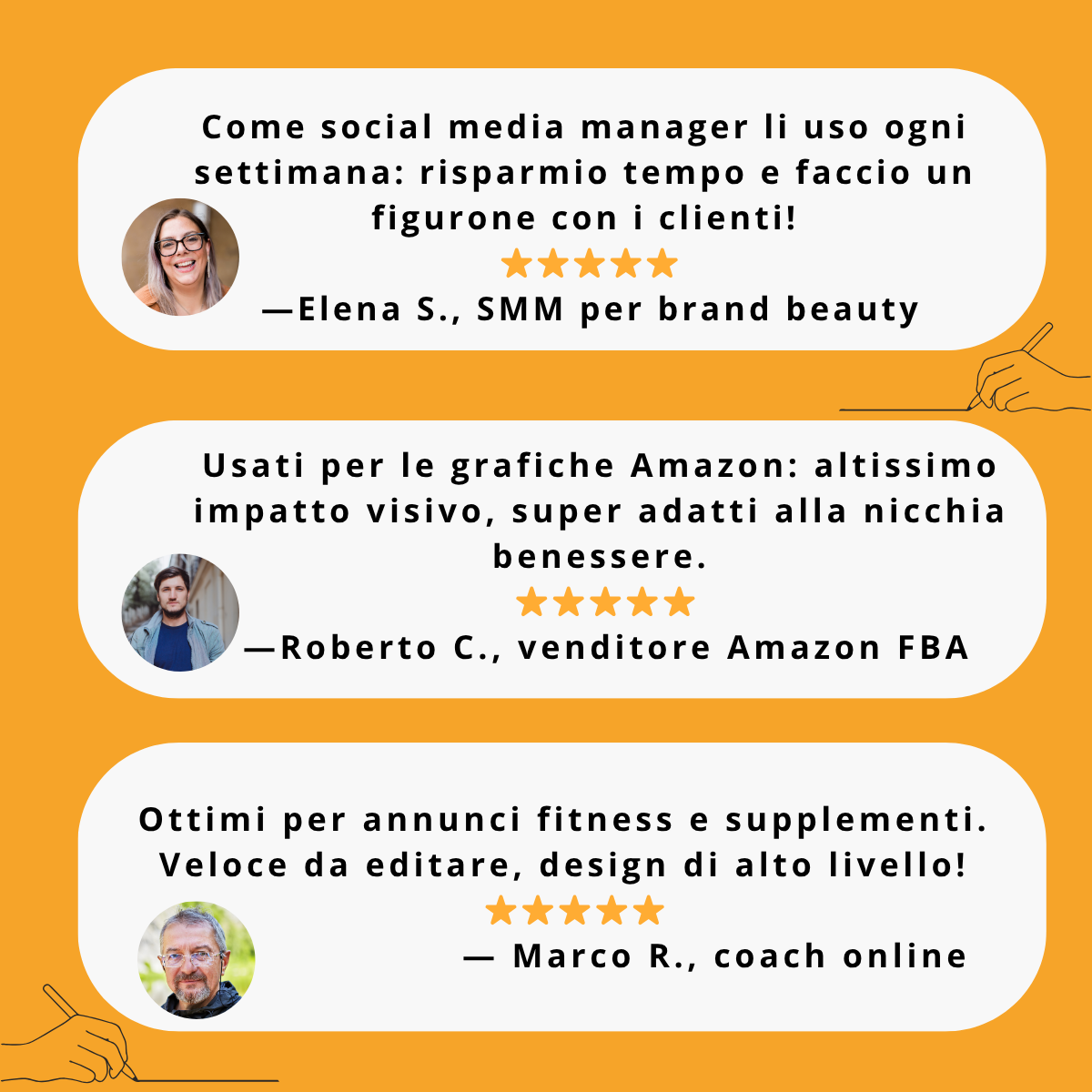 "Sono SMM per tre brand nel settore beauty: avere questo bundle ha snellito tutto il mio flusso di lavoro. Design coerente, layout perfetti per conversioni e salvataggi. Ottimizzati per Canva: top!"